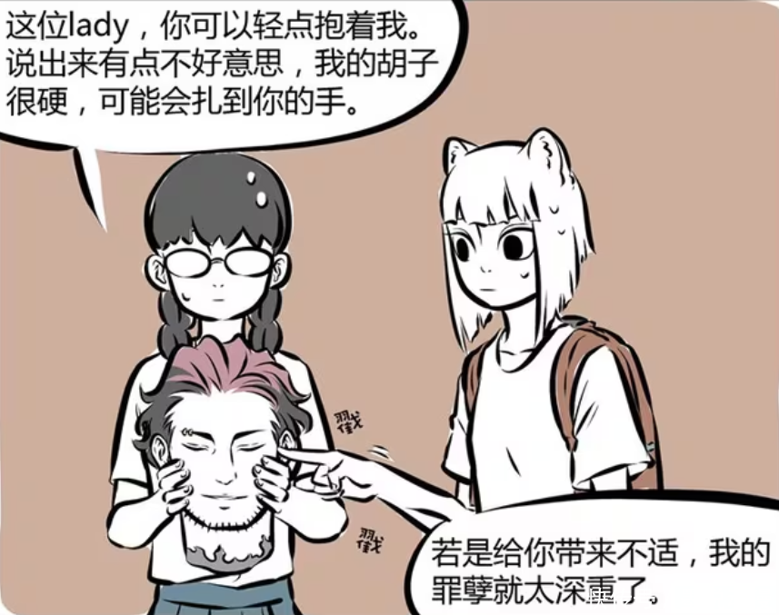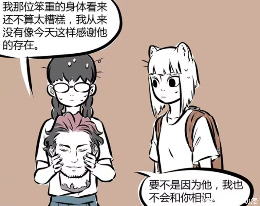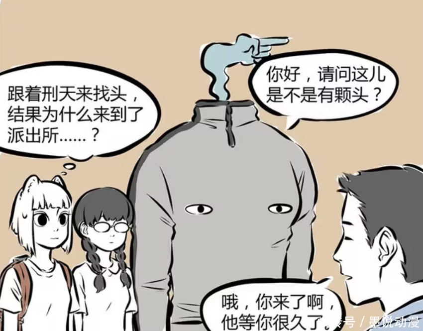 《非人哉》漫画版中,刑天、九月和杜惟去找头,最终是在派出所找到了他。刑天的头早已可以独立存在,其名为汤姆。如果只看头的话,还算是帅哥。不过杜惟接受不了,头长出触手,在被吓到之后,杜惟将汤姆直接丢掉。