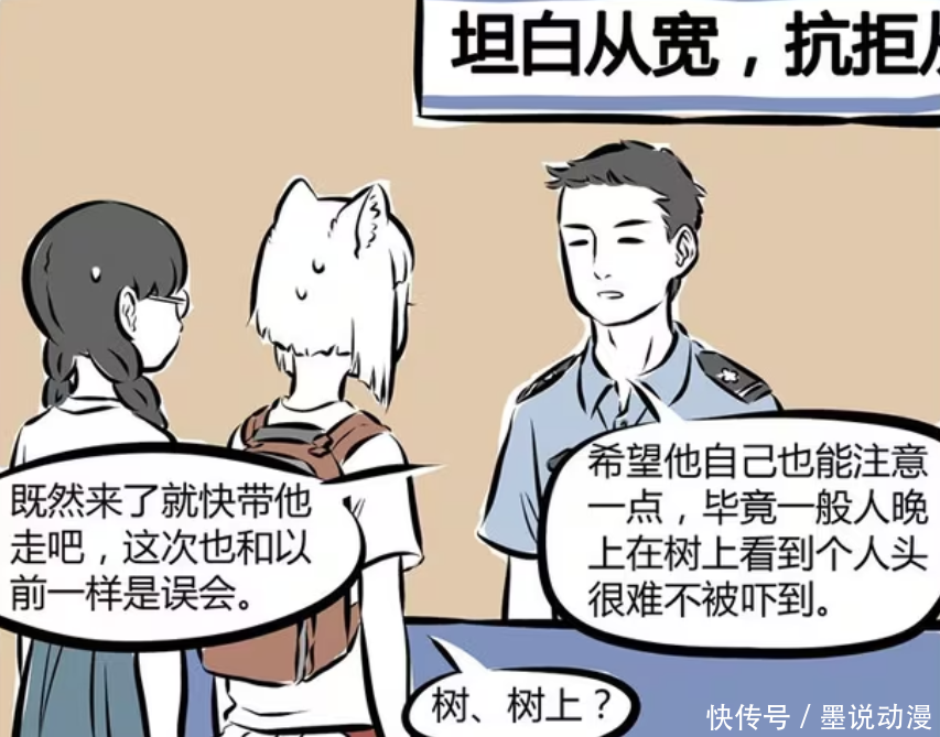 可以看出警察叔叔也不想留着这颗头,有人来认领,那就赶紧带走。那么这颗头到底是怎么回事?警察叔叔让他以后自己注意点,毕竟一般人晚上看到树上有颗头,肯定会被吓到。九月和杜惟不知道什么情况,为何刑天的头会在树上。