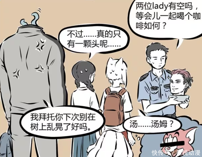此时警察叔叔拿着头,也觉得有点无奈。汤姆还不忘撩妹,邀请杜惟和九月喝咖啡。刑天很生气,让他下次不要在树上乱晃。杜惟看到汤姆的全貌之后,也表示真就只有一颗头。九月想到汤姆,就想起那只最出名的猫。